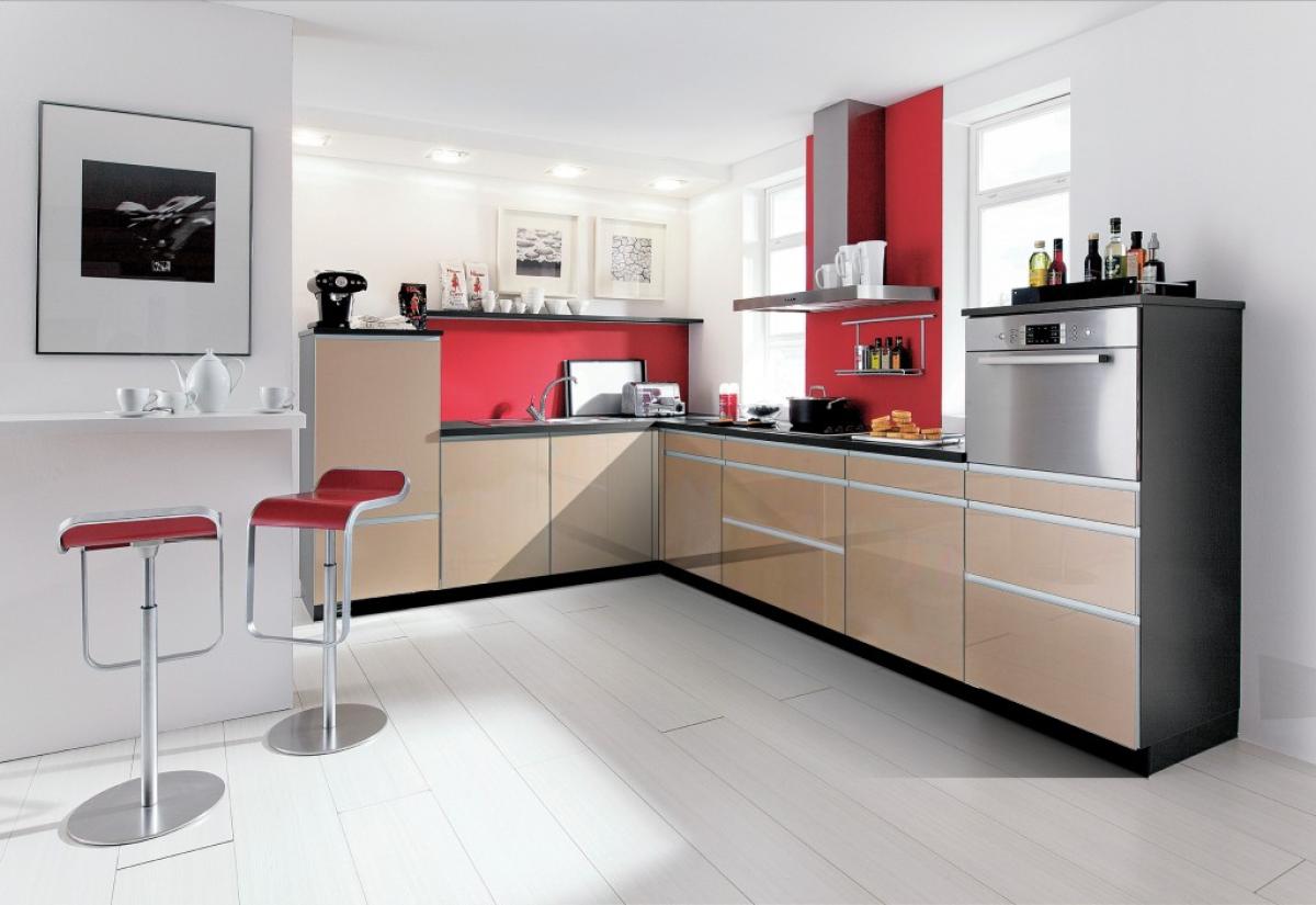 Des couleurs claires avec des touches de rouge donnent une ambiance moderne ! Ici, la cuisine accueille un espace snacking pour une collation sur le pouce ou un petit-déjeuner en tête à tête… Jouant avec le contraste des murs, les tabourets hauts s’habillent également de rouge pour une cuisine tendance. Les façades des meubles arborent une couleur cachemire soyeuse, gris anthracite, le plan de travail offre une ligne épurée à cet espace. La couleur claire et brillante des meubles bas agrandit la pièce pour une cuisine lumineuse!