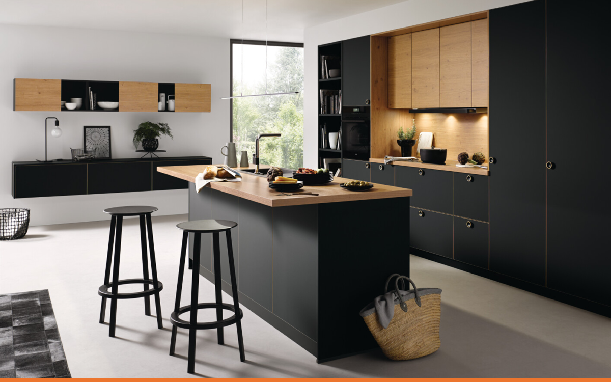 Notre modèle Bombay noir onyx mat est une cuisine ouverte chic qui dissimule la zone de cuisson tel un caméléon. Caché et encastré entre deux grandes armoires, le plan de travail se fait discret et laisse un maximum de place à l’îlot central, star de cette cuisine.