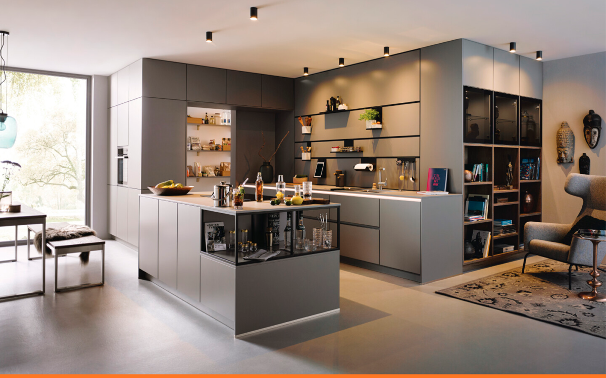 Chez Cuisines AvivA, on a plusieurs modèles qui répondent à cette tendance, comme la cuisine MILANO gris agate mat soyeux. Sans meubles hauts, ses armoires de rangement montent jusqu'au plafond pour former l'architecture du lieu. Les gorges métalliques assorties aux glissières de la crédence et aux étagères métalliques, soulignent la composition et la conception sans poignées renforce cette volonté.