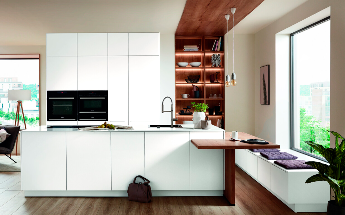 Votre espace repas peut également être la prolongation de votre plan de travail. C’est le cas pour notre modèle ANIA blanc alpin ultra mat où une petite table a été positionnée dans l’angle de l’îlot. Sans être le seul et unique espace repas de votre domicile, l’aménagement de ce petit coin est idéal pour prendre un petit-déjeuner ou un goûter.