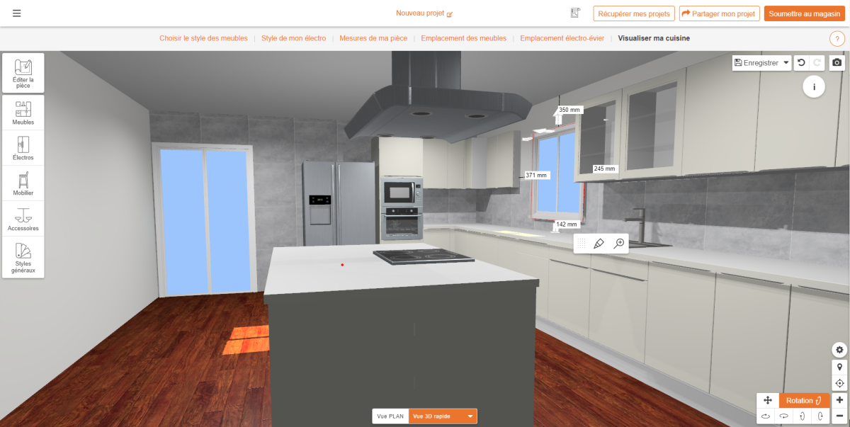 Grâce à cet outil de simulation 3D de votre future cuisine sur notre site, vous pouvez imaginer votre cuisine et la dessiner par vous-même. Choisissiez votre style de cuisine, votre électroménager, renseignez vos côtes, où vous souhaitez placer vos meubles… Cet exercice très ludique vous aidera à mettre en forme toutes vos idées ! Trouvez l'outil de dessin 3D ici.