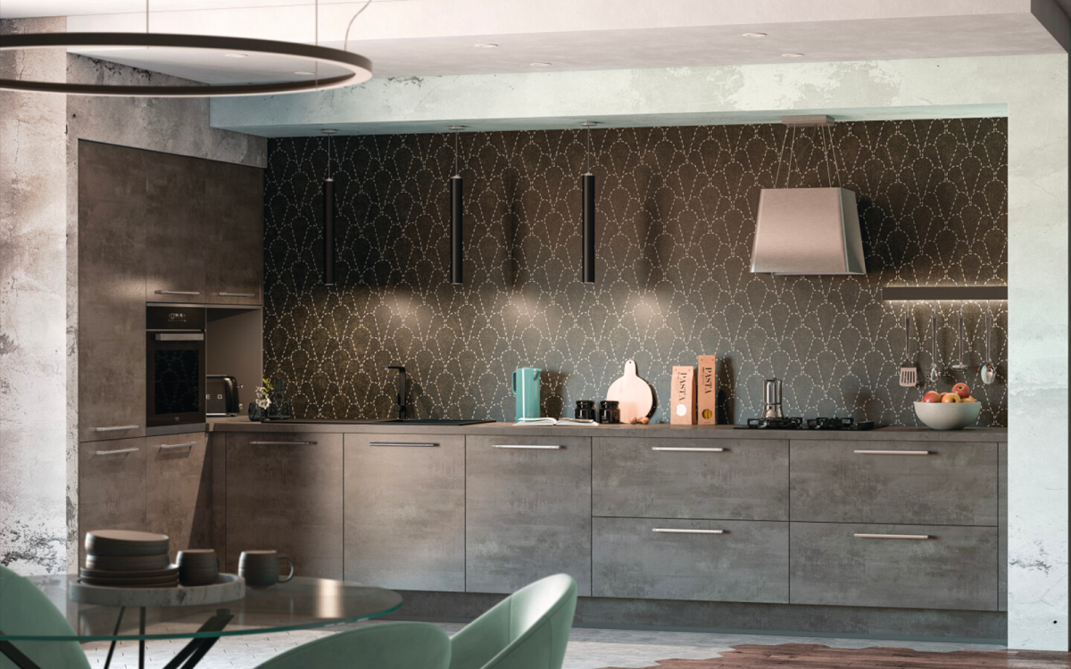 Toujours bien accompagné, il débarque avec ses amis à motifs floraux, vintage et géométriques. C’est d’ailleurs ce dernier que l’on a sélectionné pour sublimer notre cuisine ANIA. En parfaite symbiose avec cette pièce épurée, le papier peint graphique vient la dynamiser et souligner le rouge rouille des façades.
