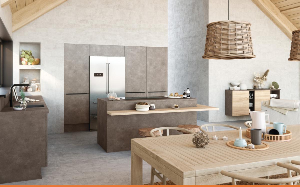 Mais plutôt que des mots, nous vous présentons notre modèle ARIA béton gris. Une cuisine épurée où béton et bois cohabitent pour apporter du contraste et de la vie à la pièce.