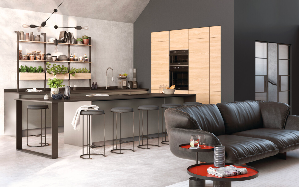 Comme on vous le disait plus haut, le bois s’inscrit dans la modernité. C’est pourquoi, chez Cuisines AvivA on aime l’associer à d’autres matières. C’est notamment le cas pour notre cuisine ARIA décor chêne somerset bar, où le chêne et l’acier cohabitent. Spacieuse, elle peut accueillir tout le monde à son bar et n’a rien à cacher d’où les étagères ouvertes.