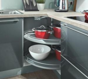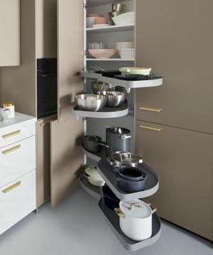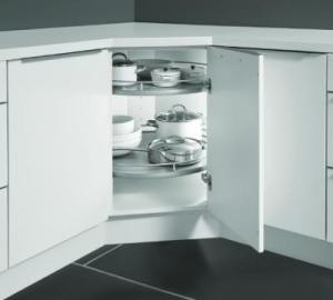 Pour un meuble d’angle de cuisine, le placard à rangement rotatif est une solution très pratique. Les étagères tournent sur elles-mêmes, permettant d’avoir accès à l'ensemble des éléments qui y sont rangés facilement. C’est un système simple, mais qui doit être conçu pour résister dans le temps malgré un usage soutenu.