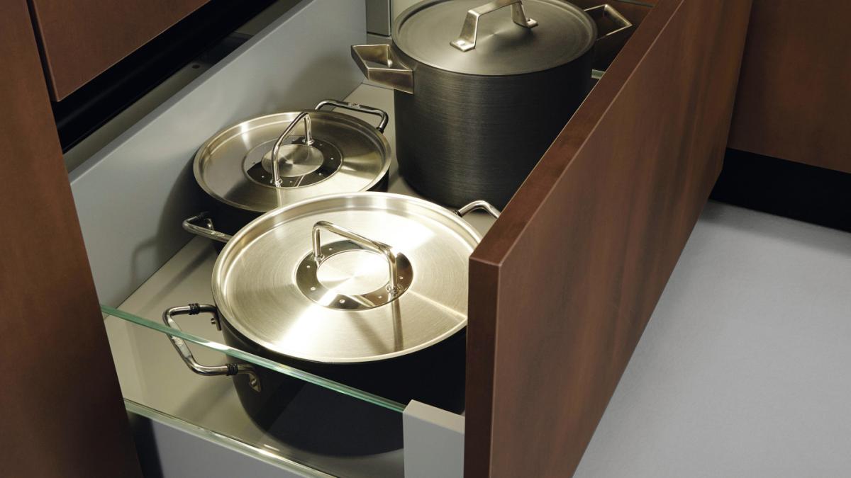 Pour les tiroirs de cuisine, nos cuisinistes ont également développé des systèmes d’utilisation pratiques et design. Dotés de glissières de précision silencieuses et invisibles, les tiroirs s’ouvrent et se déroulent sans bruit ; de plus, ils peuvent supporter des charges allant jusqu’à 70 kilos et offrent une capacité de stockage pouvant atteindre 60 litres.