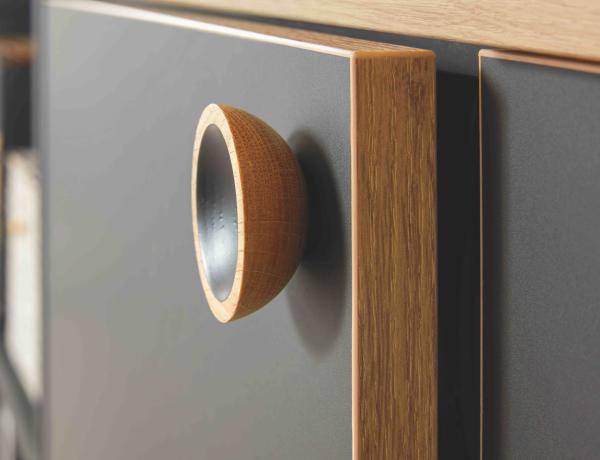Ces façades en laque mate anti-traces sont adaptés pour la cuisine puisque même les mains pleines de farine, vos meubles resteront propres. Des détails soignés, des jeux de matières entre le noir et le stratifié décor chêne noueux, un bel îlot central et un espace bar qui prolonge la cuisine, sont l’association parfaite.