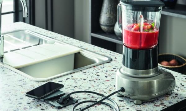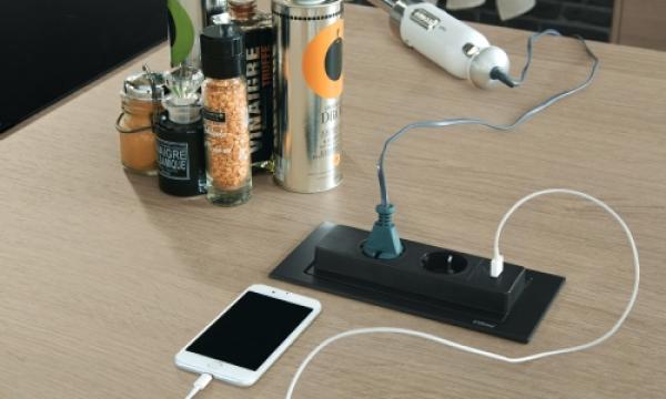 Les fils électriques et les prises font partie des éléments qui donnent une impression de désordre dans la cuisine. Grâce à des prises escamotables comme celles-ci, on évite de charger visuellement les plans de travail. C’est aussi un accessoire design non négligeable et ultra-moderne !