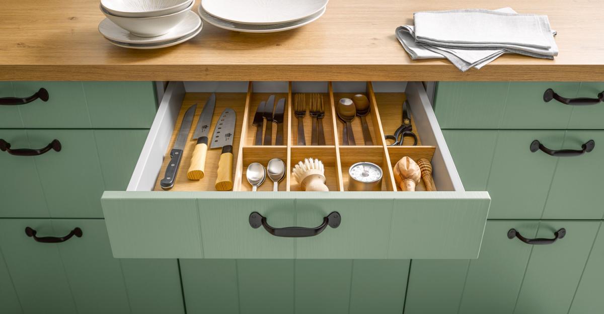 Les placards n’ont pas le monopole du rangement organisé ! Classer, ordonner et trier vos tiroirs s’avère être un gain de temps précieux au quotidien. Plusieurs astuces peuvent venir mettre de l’ordre dans vos tiroirs. Vous pouvez par exemple séquencer vos couverts, ranger vos épices, déposer vos assiettes grâce à des structures permettant de les empiler sans risque mais aussi choisir un tiroir dédié au tri afin de le séparer en plusieurs compartiments (chacun servant une poubelle de tri spécifique). Chez Cuisines AvivA, nous disposons de plusieurs modèles de tiroirs à l’anglaise pour répondre à vos besoins particuliers.