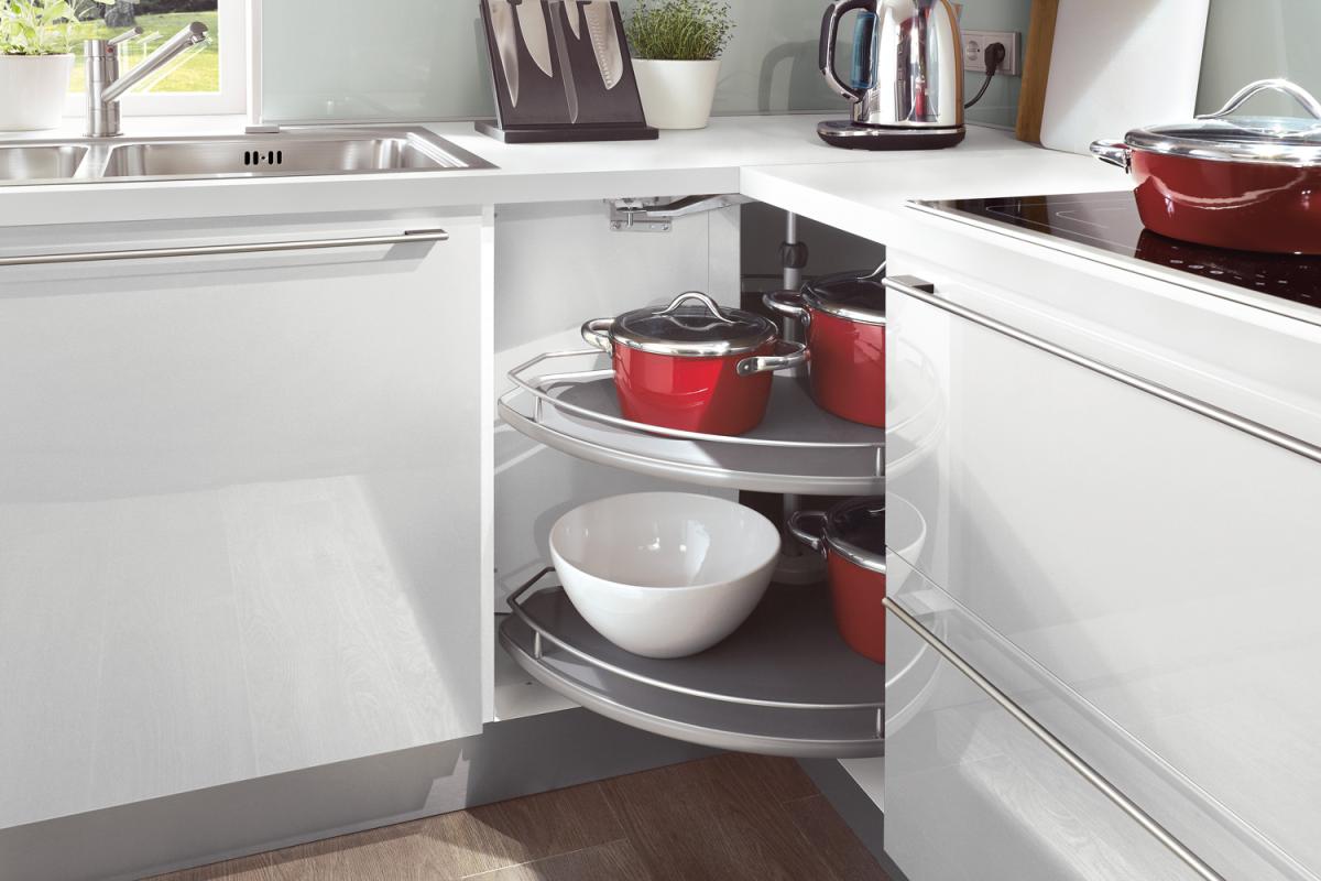 Pour ne pas perdre une miette de rangement, les placards et casseroliers d’angle abriteront aisément vos marmites en tout genre. Ces placards représentent une place de choix et un gain d’espace non négligeable pour les casseroles, les poêles et autres ustensiles envahissants !