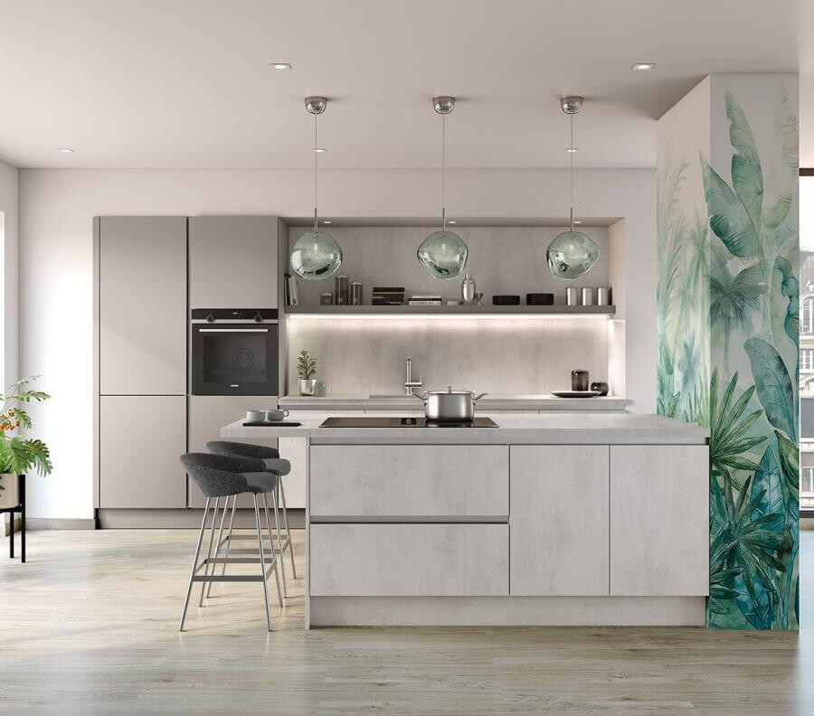 Combinaison de façades. Îlot : façade mélaminée de haute qualité Imitation Béton Gris Blanc, face arrière assortie, 4 chants sur le pourtour assortis, épaisseur : 19 mm. Colonnes et meubles bas contre le mur : façade en MDF et chants en laque mate soyeuse, coloris Gris Sable, face arrière en mélaminé laque mate soyeuse assortie, épaisseur : 19 mm.