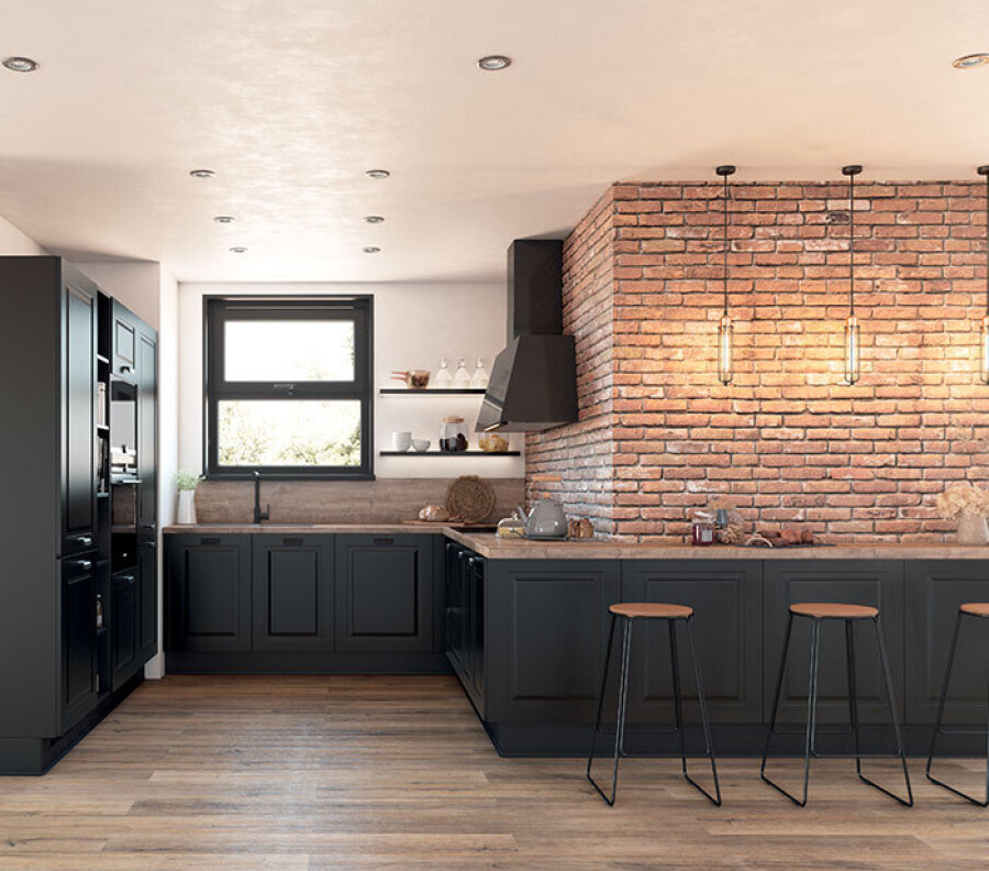 Avec ses façades en laque noire à cadre, cette cuisine marie style et fonctionnalité. L’agencement astucieux offre une zone de travail pratique, tandis que les murs en brique, le sol en bois et la hotte noire renforcent son caractère. L’extension du plan de travail devient un espace petit-déjeuner chaleureux sans envahir l’espace de travail.