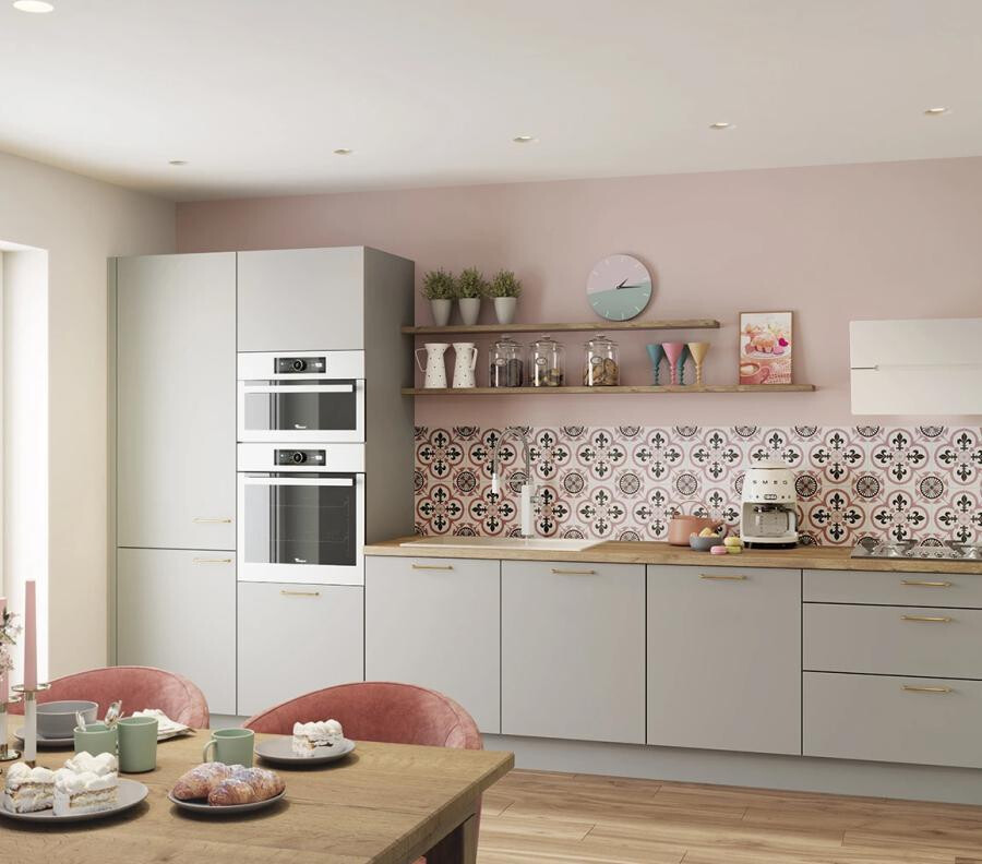 Dans cette cuisine linéaire, le gris galet des façades s’intègre parfaitement à une ambiance naturelle et apaisante. Associé à des étagères et un plan de travail en bois, il crée un équilibre chaleureux et contemporain. L’agencement astucieux optimise les rangements, tandis que la lumière naturelle, reflétée par les touches rosées, illumine l’ensemble avec élégance et douceur.