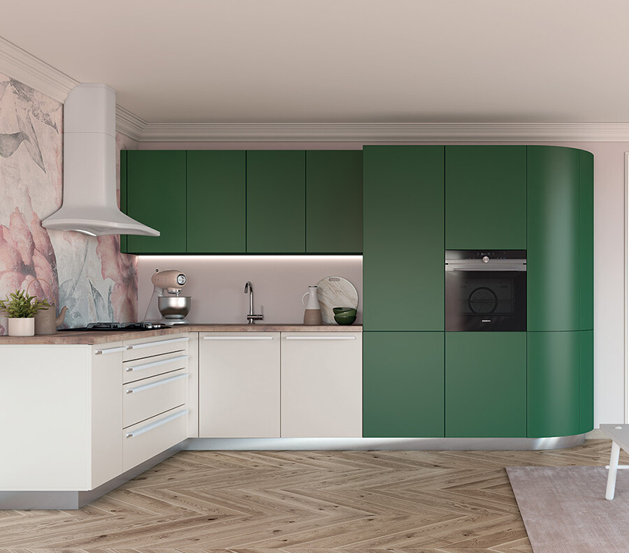 Cette cuisine en L mise sur l’élégance du contraste entre les meubles hauts et colonnes vert forêt et les meubles bas blancs. Son design allie caractère et luminosité, avec des rangements optimisés pour plus de praticité. Un meuble colonne arrondi apporte une touche originale tout en maximisant le stockage.