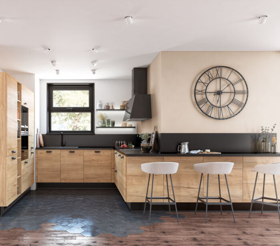 Campagne chic. Dans cette cuisine chaleureuse et conviviale, la famille et les amis trouvent toujours une bonne raison pour se retrouver. Le décor chêne sierra s’accorde avec le plan de travail et la crédence effet granit flammé pour créer une atmosphère authentique et naturelle. Croyez-le ou non, les trois tabourets de bar ne restent jamais vides bien longtemps…